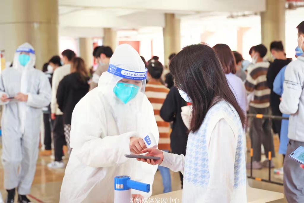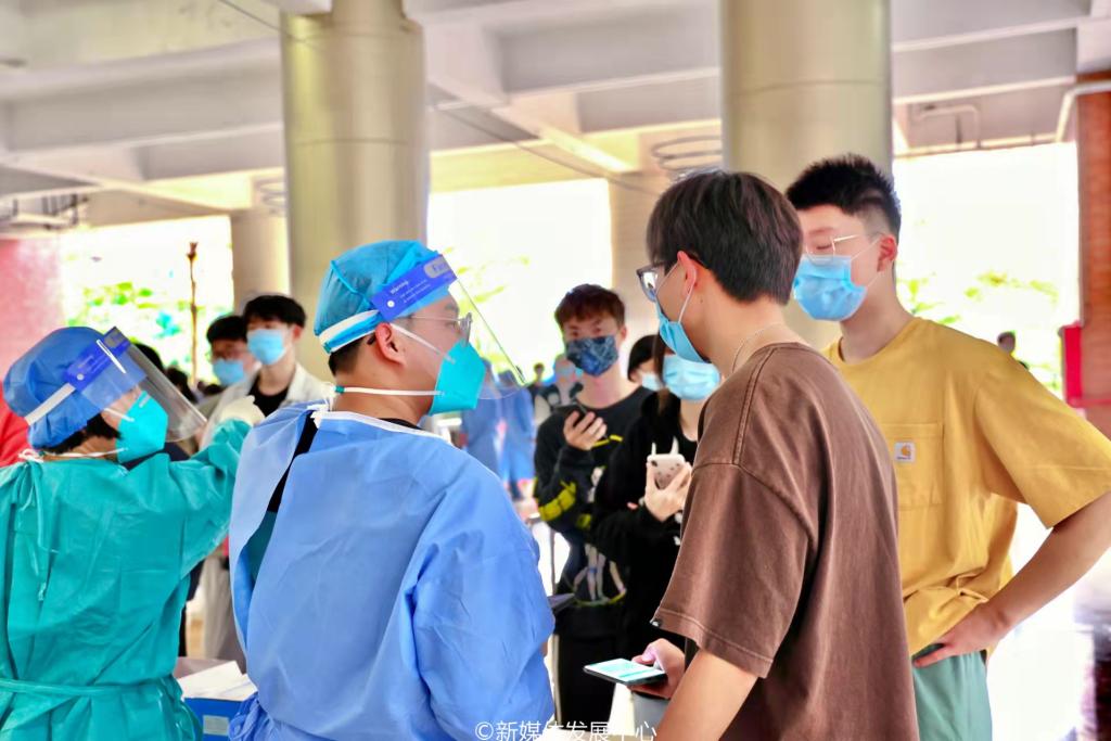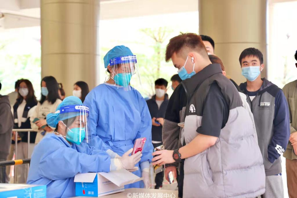 检测现场,师生员工严格按要求佩戴口罩、保持一米间隔有序排队,不交谈、不聚集。所有人员提前生成常规采样核酸检测二维码,减少现场拥堵。在工作人员和学生志愿者的引导下,有序完成核酸样本采集等流程,即检即走,按指定路线离开。过程有条不紊、忙而不乱。
