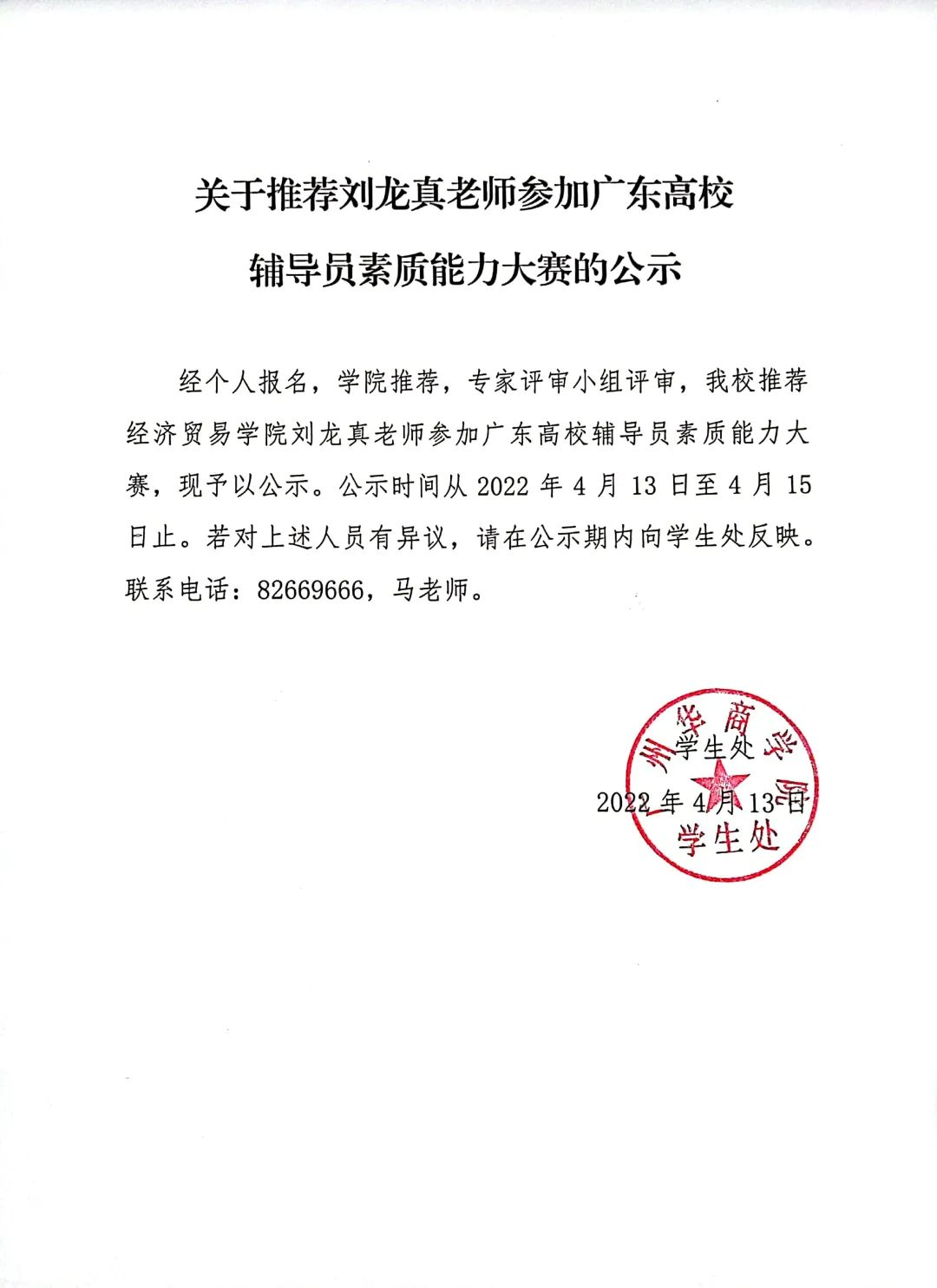 经个人报名,学院推荐,专家评审小组评定,威廉希尔中文网站推荐经济贸易学院刘龙真老师参加广东高校辅导员素质能力大赛,具体公示如下: