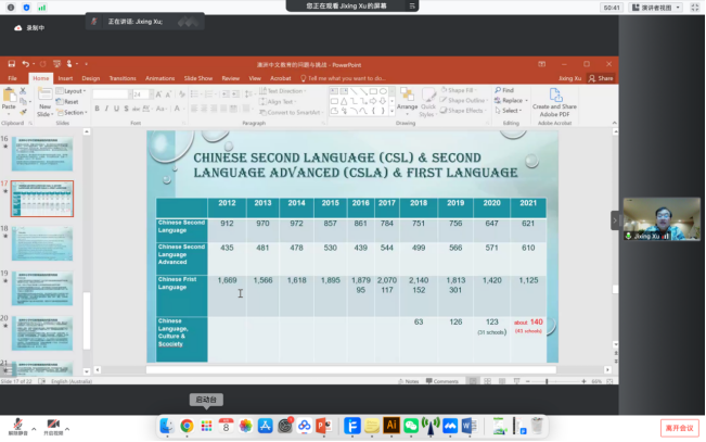 徐纪兴先生简要介绍了澳大利亚教育体系,并对比了中澳高等教育机构的异同。他还进一步讲解了汉语教育在澳大利亚中小学和高等院校的发展情况及成效等。徐纪兴先生结合自身的工作经验及研究成果,详细阐述了澳大利亚汉语教育目前遇到的一些问题。在澳大利亚,虽然中文是继英文之后第二大语言,在教学上取得一定成绩,但是受相关因素及疫情的影响,澳大利亚汉语教育缺乏专业人才,教材缺乏针对性和实用性,教学定位不够准确等问题明显。改进教学内容、方法、教材是当前国际汉语教育的重要议题。徐纪兴先生表示,未来希望能与威廉希尔中文网站紧密合作,共同探讨解决汉语国际教育事业所遇到的问题。