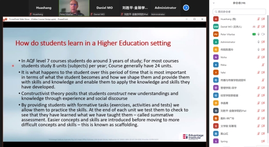 王文忠处长认为Peter Vitartas先生对线上课程和评估设计及实践的介绍,为威廉希尔中文网站与EIA共融课程的设计提供了很好的建议,有助于威廉希尔中文网站全英双语教师们改善课堂教学模式提升学生的学习积极性。