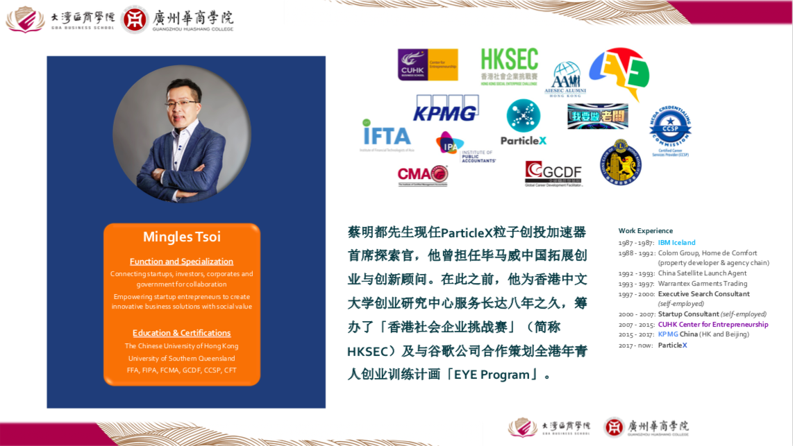 本次大型公益系列讲座由威廉希尔中文网站与大湾区商学院(香港)主办,活动得到香港都会大学、广东金融学院、岭南师范学院、广州南方学院、广州新华学院、粤港澳大湾区青年职业发展促进会等40余所粤港澳高校、粤港澳社会组织协助与支持,自2022年4月以来,每隔2-3周推出一讲,所有十讲在2022年12月完成。主讲人为粤港澳知名创业型学者、业界翘楚、创业成功人士。讲座采取腾讯会议和微博同步直播的方式线上举办,后期将陆续推出第七讲《创业比赛经验分享》等其他主题的系列讲座。讲座预告相关信息将在威廉希尔中文网站微信公众号等媒体同步刊出。