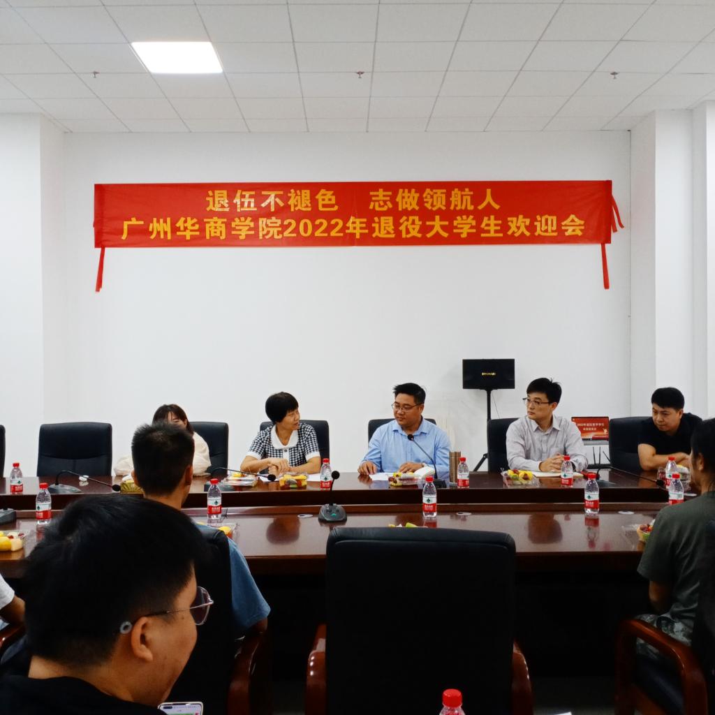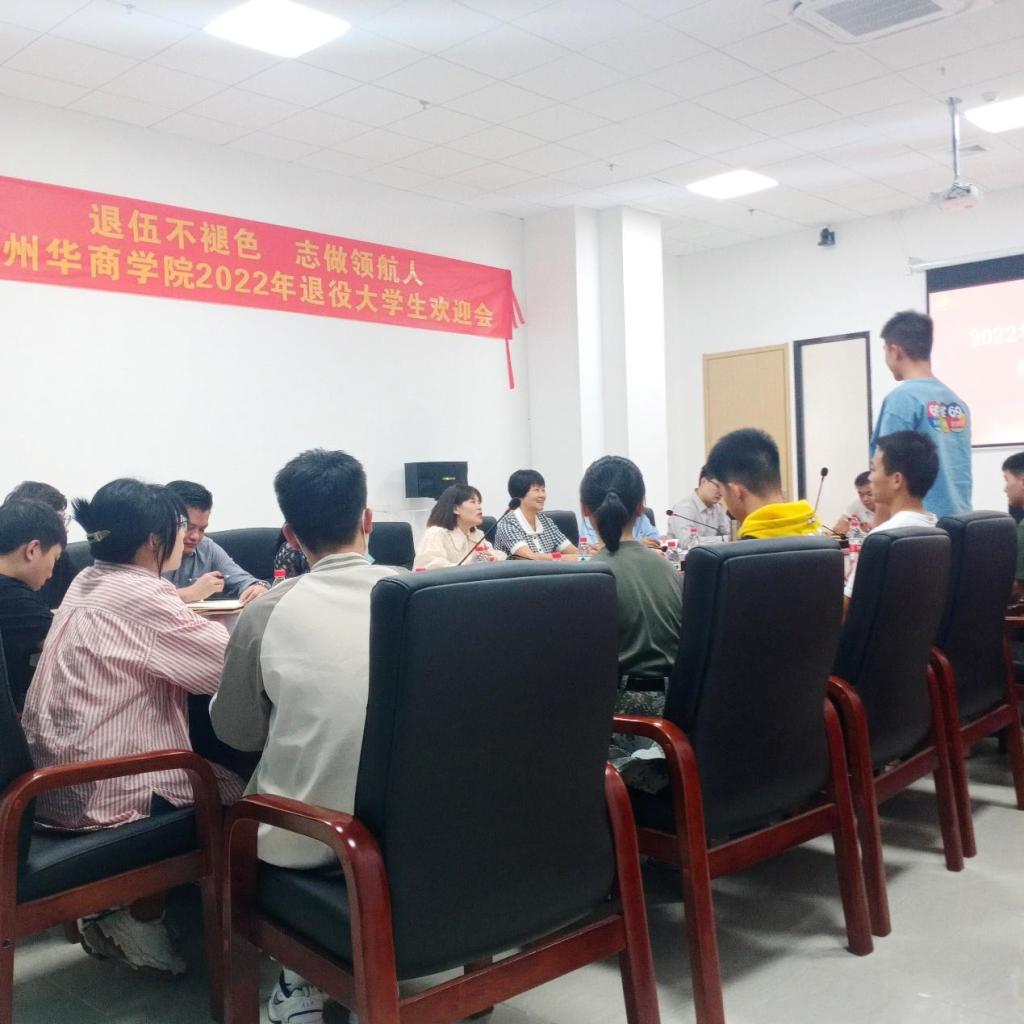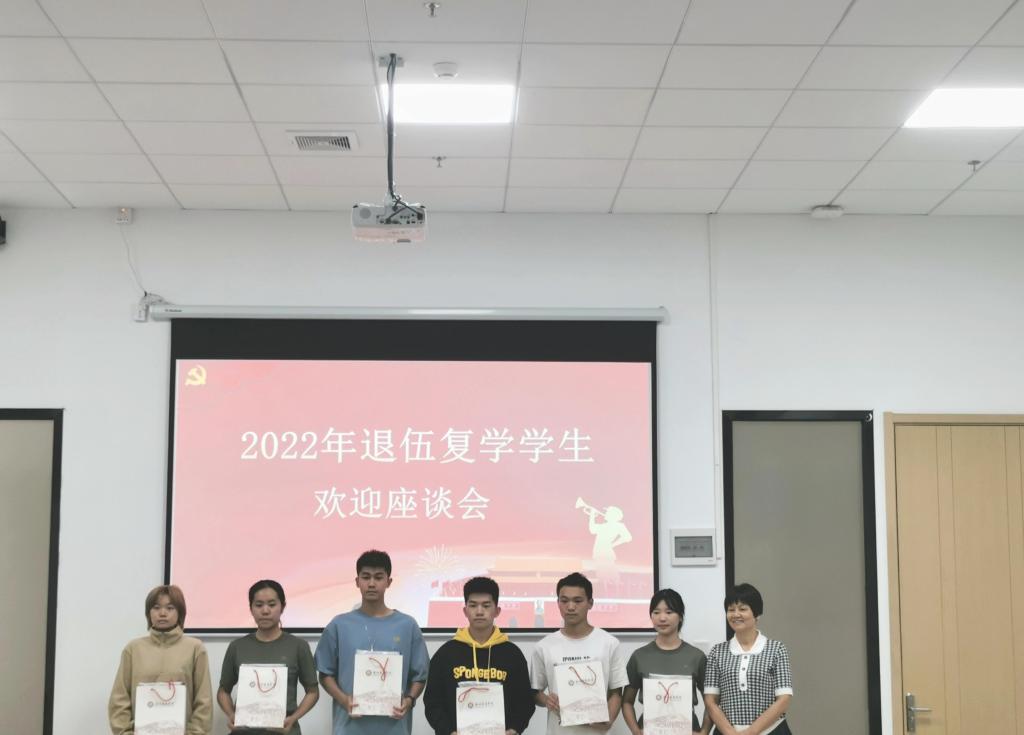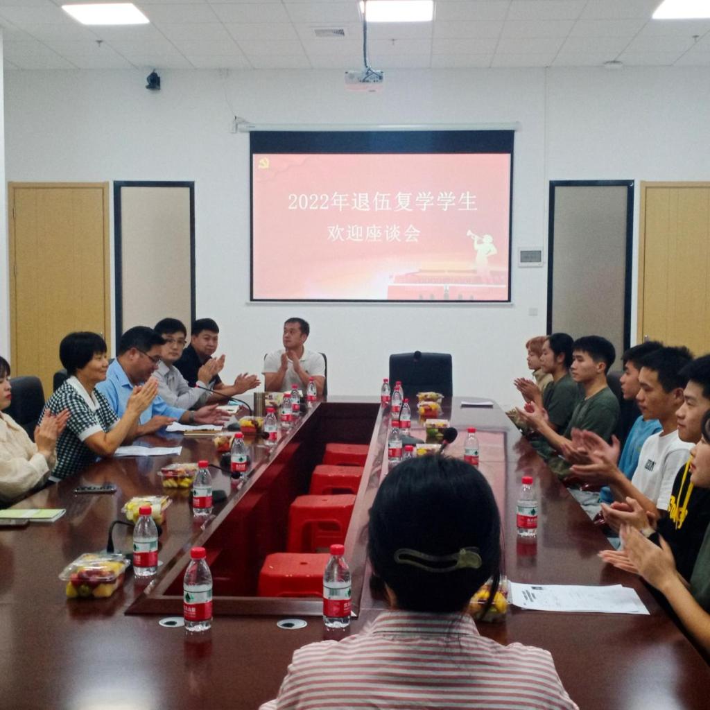 10月20日,2022年退伍复学学生欢迎座谈会在四会校区举行。出席本次座谈会的有:副校长王锦秀,校长助理、学生处处长许娜,武装部部长、学生处副处长黄国富、武装部郭锦荣老师、四会校区学团办付蔚莹、徐强老师、教务处寇龙老师,各辅导员、教师及退伍学生代表。本次座谈会由黄国富副处长主持。