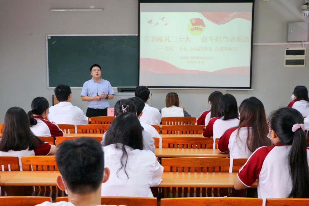 随后,校团委杨图珍老师部署学生社团学习宣传贯彻党的二十大精神相关工作。她鼓励社团管理部、各社团要认真学习党的二十大精神,凝心聚力推动社团建设,组织开展形式多样、主题明确、生动有效的系列学习活动。社团成员要将党的二十大精神落实到自己的学业生涯和未来发展上、落实到以社团组织为载体的历练成长与打造社团品牌上,真正发挥学生社团落实立德树人根本任务、推进素质教育的作用。