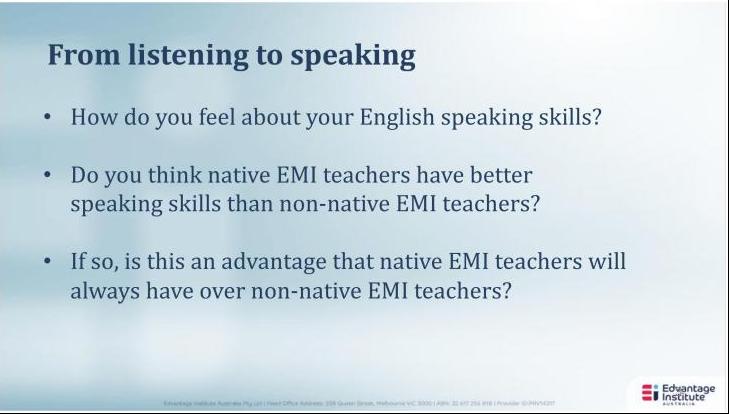 本期专项培训的主讲人是戴伟(David)博士, 第一场的主题是《语言转换双语(全英)教学对学生的影响》。戴伟博士通过介绍英语作为教学语言EMI(English as a Media of Instruction)对教学效果影响的研究;通过英语为母语和英语为非母语教师的教学作对比,分析了教师们的语音对学生学习的影响。他的研究显示英语作为授课语言时,学生更偏好熟悉的口音,这样可以降低他们的焦虑使学生能专注于专业内容的学习;口音不会对学生学习造成太大影响,相反在一定程度上能够促进学习。