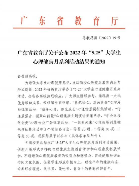 为增强大学生心理健康意识,推动高校心理健康教育内容与形式创新,提高大学生心理素质,广东省教育厅举办了“5.25”大学生心理健康月系列活动,活动涵盖心理漫画、心理情景剧、心理健康主题演讲、心理公益广告、心理拓展训练微视频等内容。