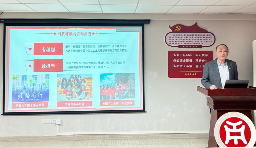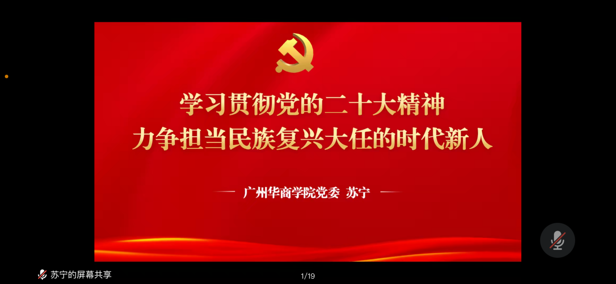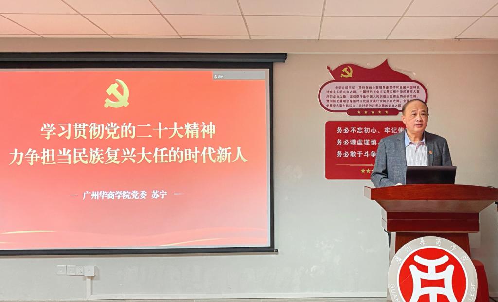 学校党委苏宁书记为大家进行党的二十大精神专题授课。授课内容主要内容包括三个方面:一是介绍会议基本概况;二是一起学习党的二十大精神;三是习近平总书记殷切寄语广大青年,号召广大青年立志做有理想、敢担当、能吃苦、肯奋斗的新时代好青年。他强调,党的二十大是在全党全国各族人民迈上全面建设社会主义现代化国家新征程、向第二个百年奋斗目标进军的关键时刻召开的一次十分重要的大会,是一次高举旗帜、凝聚力量、团结奋进的大会,在党和国家历史上具有重要里程碑意义。学习宣传贯彻党的二十大精神是当前和今后一个时期全党全国的首要政治任务。党的二十大报告重在回答几个问题:举什么旗、走什么路、以什么样的精神状态,朝着什么样的目标继续前进。旗帜是高举中国特色社会主义伟大旗帜;道路是全面贯彻新时代中国特色社会主义思想;精神状态是弘扬伟大建党精神,自信自强、守正创新,踔厉奋发、勇毅前行;前进目标是为全面建设社会主义现代化国家、全面推进中华民族伟大复兴而团结奋斗。最后,他号召华商青年学子要紧密团结在以习近平同志为核心的党中央周围,深刻领悟“两个确立”的决定性意义,更加自觉地增强“四个意识”、坚定“四个自信”、做到“两个维护”,引领广大青年听党话、跟党走,怀抱梦想又脚踏实地,敢想敢为又善作善成,在全面建设社会主义现代化国家、全面推进中华民族伟大复兴的新征程上,书写无愧于历史、无愧于人民的崭新青春篇章。