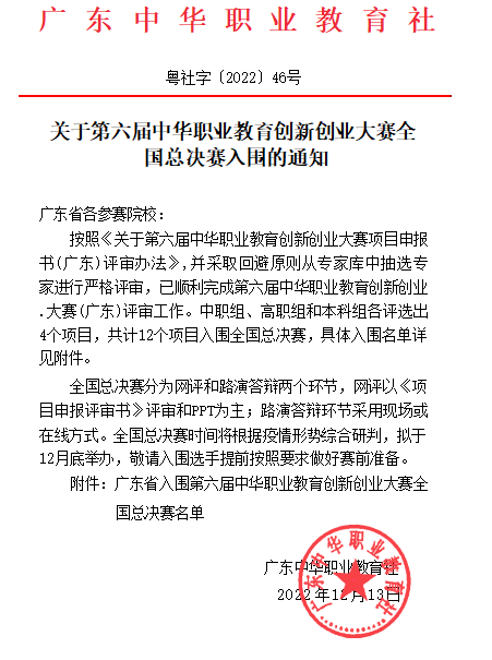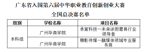 12月13日,广东中华职业教育社公布第六届中华职业教育创新创业大赛全国总决赛入围名单,威廉希尔中文网站“承宣科技一未来涂附磨具行业领导者”“稚影传媒—融媒体领域专业服务商”两个项目成功入围全国总决赛。