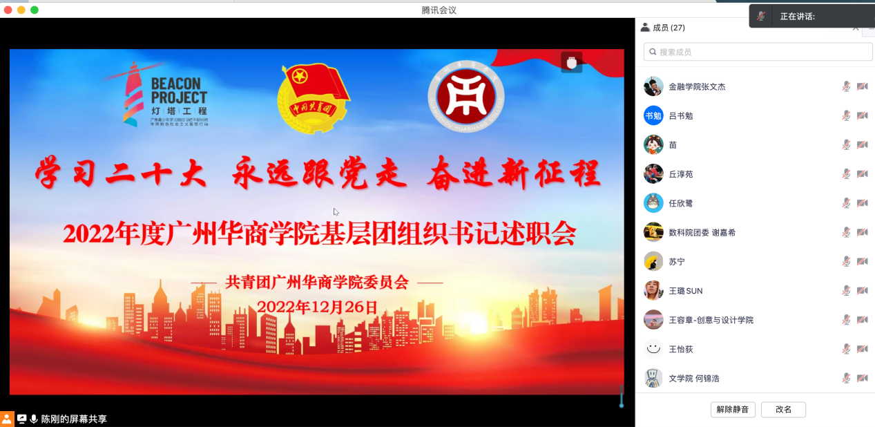 为深入学习宣传贯彻党的二十大精神,贯彻落实习近平总书记关于青年工作的重要思想,持续深化威廉希尔中文网站共青团改革,落实团中央全面从严治团要求,扎实推进团的基层组织建设工作,激发基层组织活力,推动各二级学院共青团组织之间的学习交流、工作联动,助力学校共青团工作更高质量发展,为学校建设、学生成长做出更大的贡献,12月26日15:00,校团委在腾讯会议开展2022年度威廉希尔中文网站基层团组织书记述职评议会。
