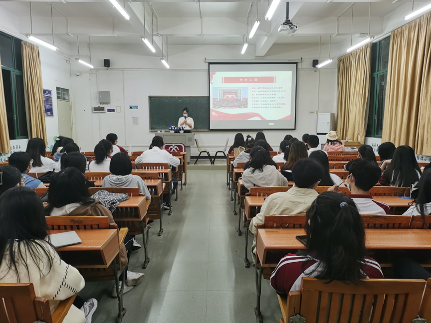 11月27日19:30,外国语学院团委在励志楼开展“学习二十大,永远跟党走,奋进新征程”的专题团课,外国语学院团委书记郭宇洁为学院团委、学生会工作人员、部门负责人及主席团成员授课。郭老师以“讲授+互动”的方式组织同学们深入学习党的二十大报告、习近平总书记参加党的二十大广西代表团讨论时的重要讲话、习近平总书记在党的二十届一中全会的重要讲话等内容,引导学员理解党的二十大的主题、过去5年的工作和新时代10年的伟大变革。通过这次专题学习,外国语学院的学生骨干们更加坚定不移听党话、跟党走的理想信念,立志成为怀抱梦想又脚踏实地,敢想敢为又善作善成,立志做有理想、敢担当、能吃苦、肯奋斗的新时代好青年。