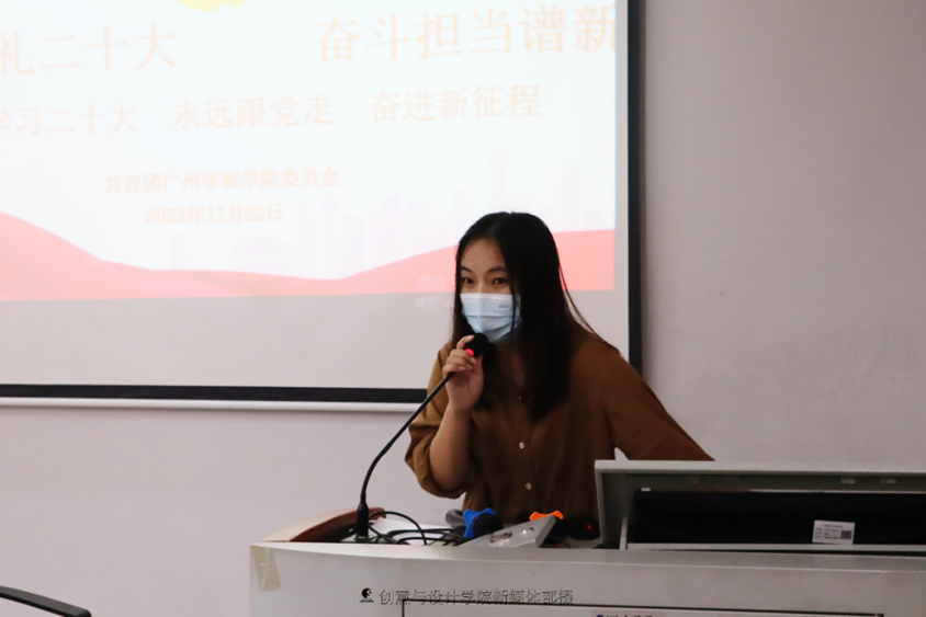 中国共产党第二十次全国代表大会是在全党全国各族人民迈上全面建设社会主义现代化国家新征程、向第二个百年奋斗目标进军的关键时刻召开的一次十分重要的大会。为了深入学习党的二十大精神,成为听党话、跟党走,堪当民族复兴重任的时代新人,11月18日中午,创意与设计学院团委在厚德楼B101召开主题团课,学习内容为党的二十大报告原文,参加人员为20、21级团支书以及学院团学骨干全部成员。此次团课由蔡舒老师主讲。蔡老师号召同学们在学习生活中贯彻落实党的二十大的精神,牢记时代使命,为全面建设社会主义现代化国家团结奋斗,在新时代、新征程,践行“请党放心,强国有我”的铮铮誓言。