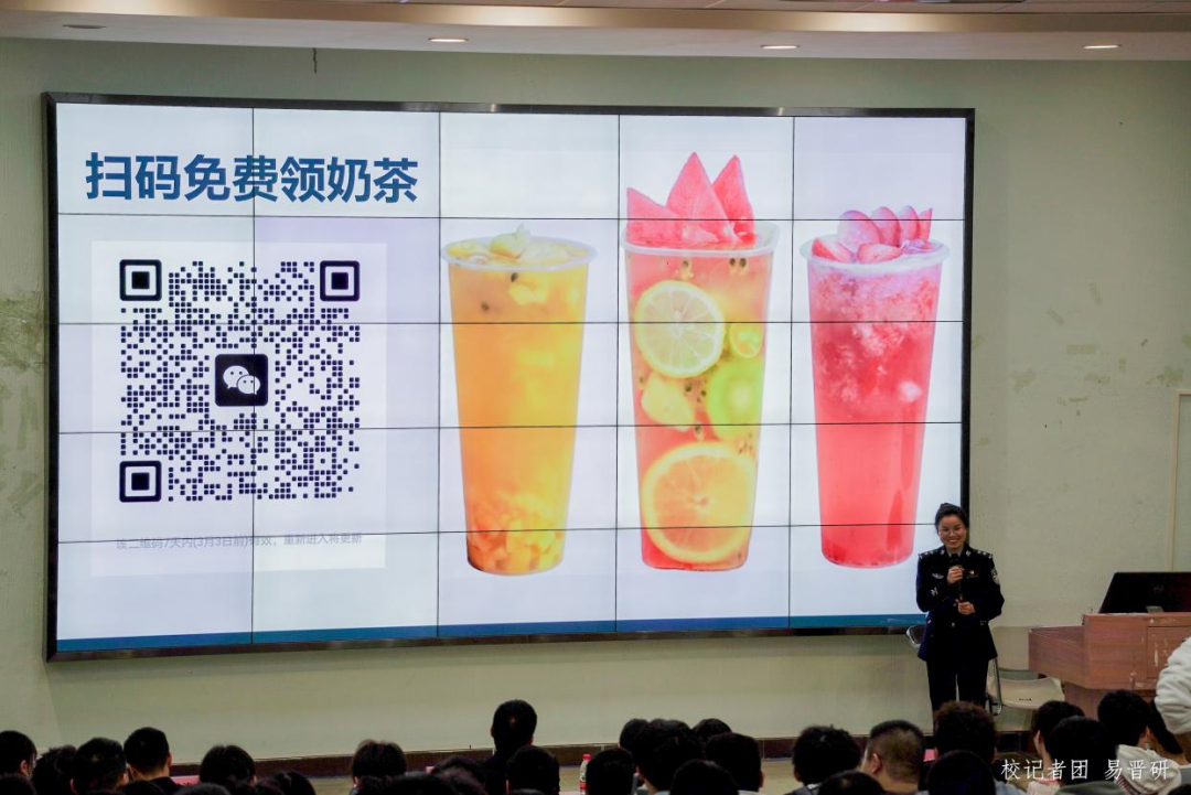 增城区分局刑警大队董悦秀警官以“进群喝奶茶”、“进群交朋友”的方式进入主题,活跃现场。通过典型的现实案例和跌宕起伏的视频讲解了兼职刷单、冒充客服、杀猪盘诈骗、网络交友四种网络诈骗形式,让学生深刻认识到电信诈骗的危害,掌握了常见的电信诈骗的类型特点、手段方式及应对处理方式。同时提醒各位同学: