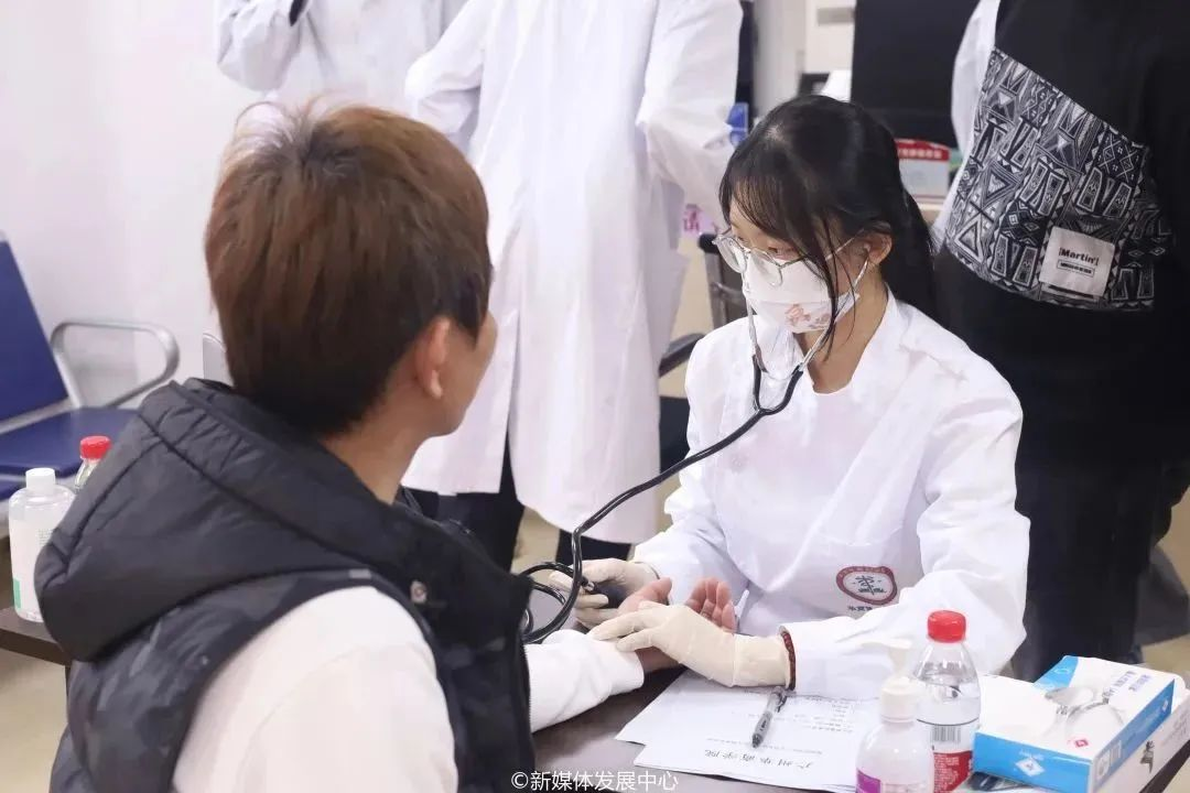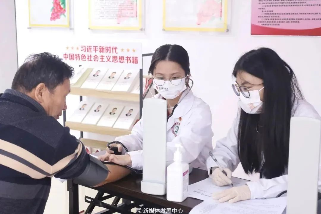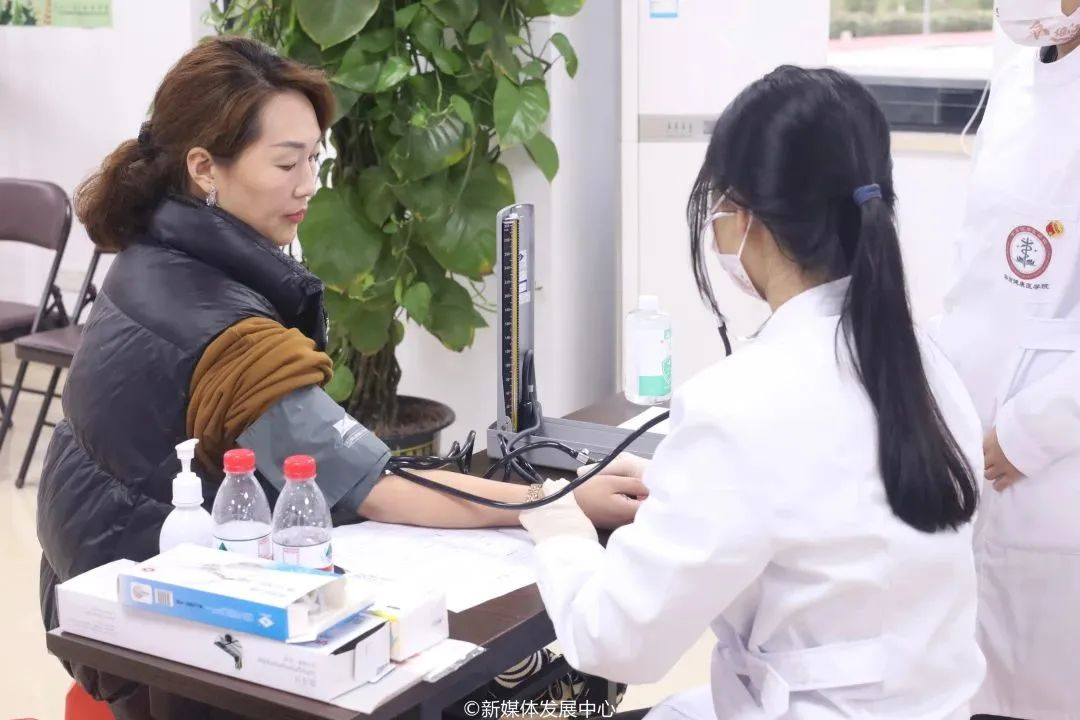 量血压区,学生志愿者们主动询问村民身体健康状况,为他们科普电子血压计的用法、高血压的防与治等知识;对检查发现是血压高的村民还特意叮嘱饮食、生活等方面的注意事项。