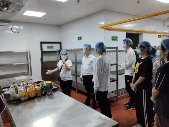 师生代表们在后勤工作负责老师的带领下,按照有关要求,戴上一次性手套、口罩和头套,首先参观了公示栏。随后,师生代表在负责老师的指引下,走进食堂后厨仓库、粗加工间、烹饪间、消毒间、留样间、洗消间,详细地介绍了后厨生产加工及食品卫生情况,原料严格按照离地、上架、分类、装筐、存柜、进箱、入盒等进行存放。最后,师生代表参观了“明厨亮灶”,详细了解校园食品原来存储、生产、加工等方面的安全管理措施和监控过程。