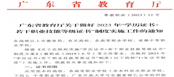根据教育部《关于在院校实施学历证书+若干职业技能等级证书”制度方案》和广东省教育厅等文件要求,广东省2023年学历证书+职业技能等级证书制度试点工作在威廉希尔中文网站展开。