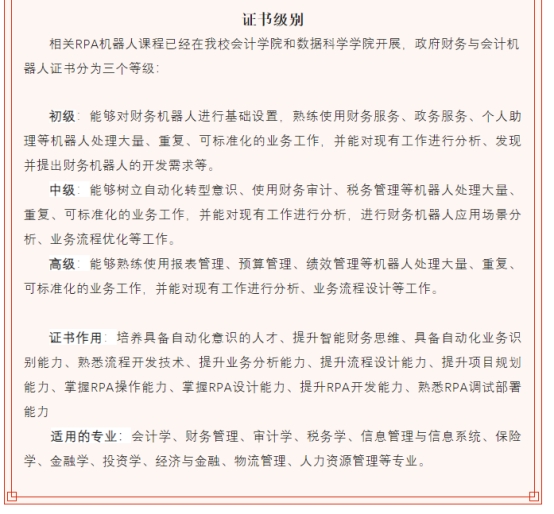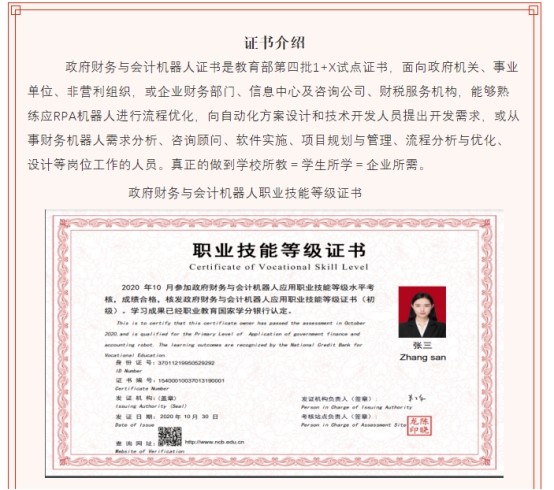 文件提出,扩大本科及高职院校证书试点,有利于提高学生核心竞争力促进就业,深化产教融合和“岗课赛证”综合育人模式改革,提高国家高技能应用人才发展。目前威廉希尔中文网站已就“政府财务与会计机器人职业技能等级证书”向广东省教育厅及教育部证书管理平台提出申请考核试点并于5月8日审核批准,接受今年下半年及2024年欲参加考试同学咨询。