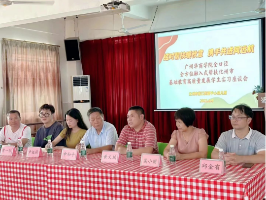 9月4日中午,教院学子在申和平教授、尹娅娟老师和曹一彤老师的带队下,平安抵达化州市。并于当天下午,在化州市鉴江街道中心幼儿园召开了威廉希尔中文网站全口径全方位融入式帮扶化州市基础教育高质量发展学生实习座谈会。化州市教育局领导、平定镇中心幼儿园尤福南园长、化州市鉴江街道中心幼儿园吴小丽园长、教师教育学院带队老师以及各位实习生们出席了本次座谈会。