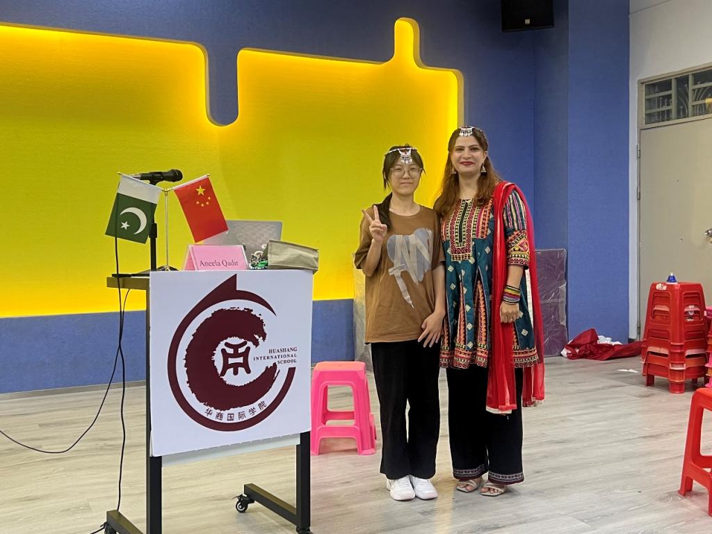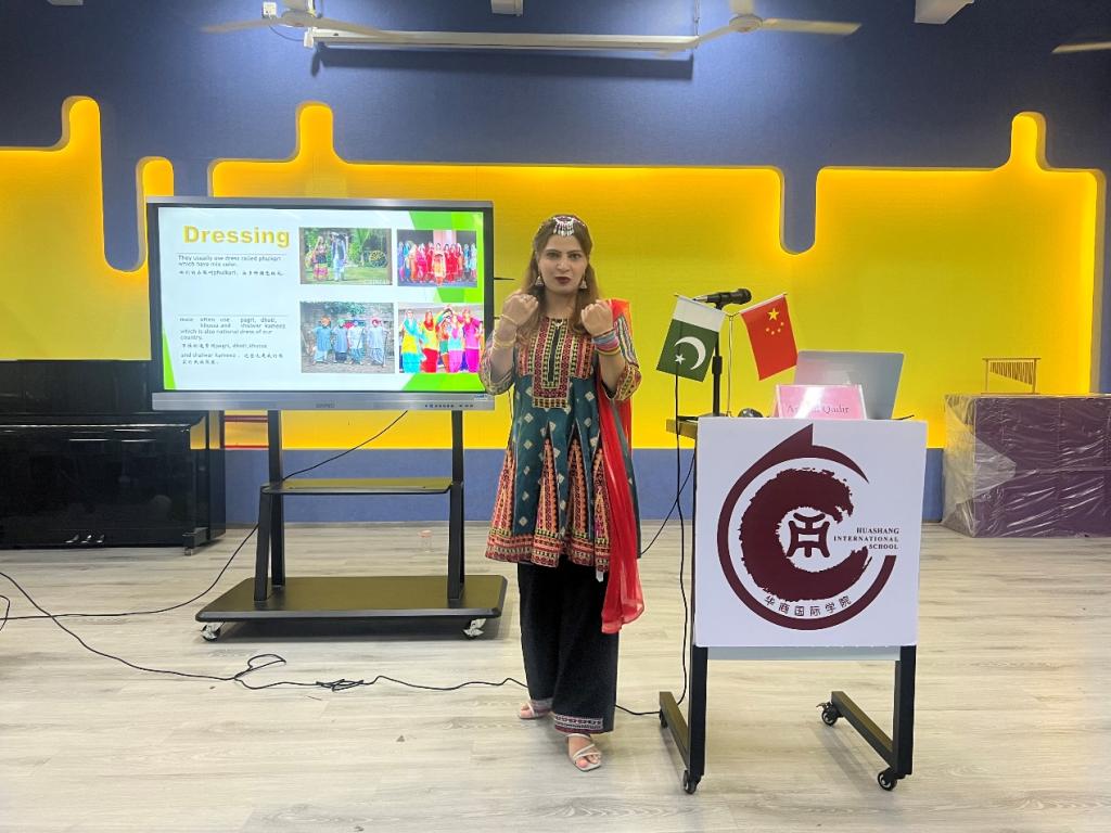 Aneela Qadir博士的精心准备,为师生们带来了一场视听盛宴与美食之旅。通过通俗易懂的图文讲解、载歌载舞的视频分享,她向师生们介绍了巴基斯坦国家概况与古老文化,其中包括国旗、国歌、省份、民族服饰、特色美食与节日、宗教等内容。她还通过讲述自身经历使大家深入了解了巴基斯坦的婚礼习俗,通过播放视频歌曲让大家共同见证中国与巴基斯坦两国牢固深厚的友谊。现场观众不仅认识了能歌善舞、美丽热情的巴基斯坦人民,更了解到了风光旖旎、文化深厚的巴基斯坦。在音乐椅与有奖竞答互动环节,同学们积极参与,获胜者赢得了极富巴基斯坦特色的精美饰品。