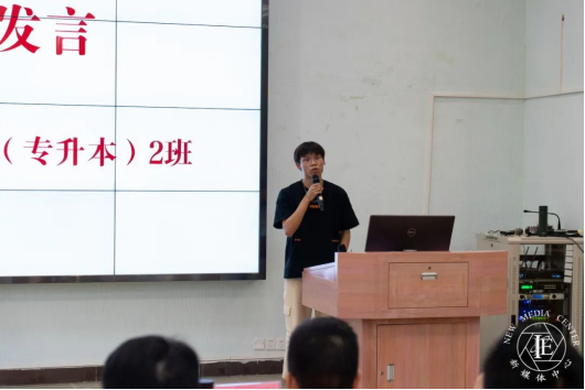 随后,2021本电子商务(专升本)2班胡宇轩同学和2023本人工智能班张琳同学分别作为新生代表发言,他们向大家分享了入学后的感受以及与高中的不同之处,并立志在大学做一个追求知识与智慧,身心健康,全面发展的人。