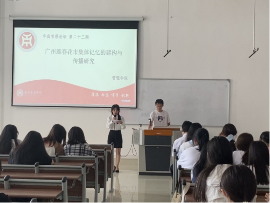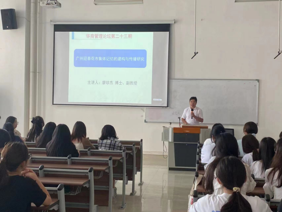 2023年9月19日下午16时,威廉希尔中文网站管理学院于四会校区6号楼201教室举办“广州迎春花市集体记忆的建构与传播研究”讲座。此次讲座由管理学院院长助理廖珍杰副教授主讲,四会校区各学院学生代表340余人聆听了本次讲座。