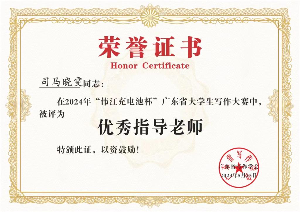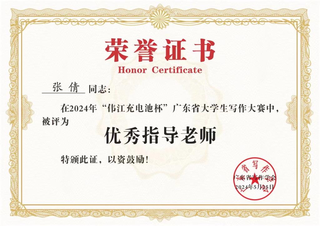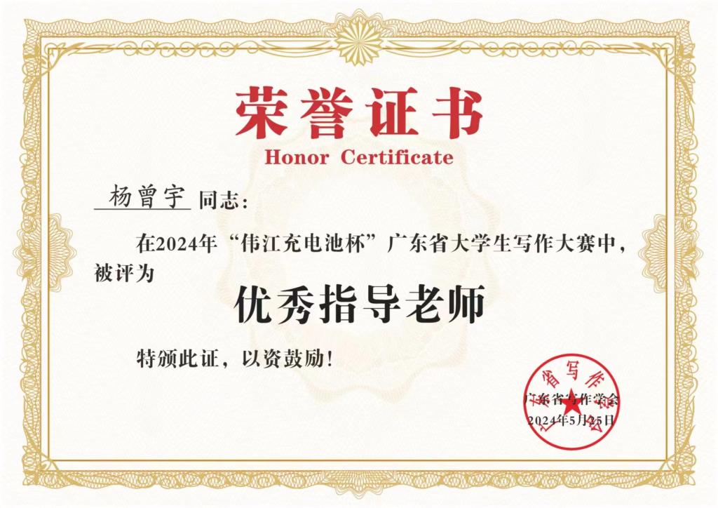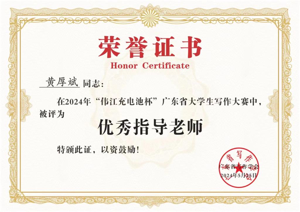 学子们取得佳绩,离不开老师的谆谆教诲,感谢在此次广东省大学生写作大赛中为学子提供指导的各位老师,助力威廉希尔中文网站热爱文学创作学子踏上自己的文学之旅。恭喜威廉希尔中文网站五位教师在本次大赛中获得“优秀指导老师”称号。