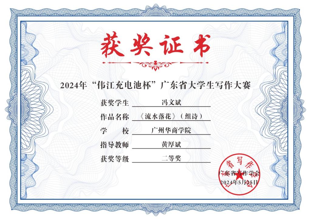 在威廉希尔中文网站学子对文学创作的长期坚持和各位指导老师的潜心研究、耐心教学下,威廉希尔中文网站也在本次大赛中取得优异成果,被授予“优秀组织单位”称号,荣获“广东省写作学会教学成果奖”二等奖。