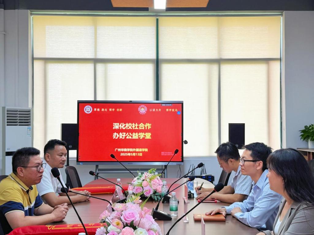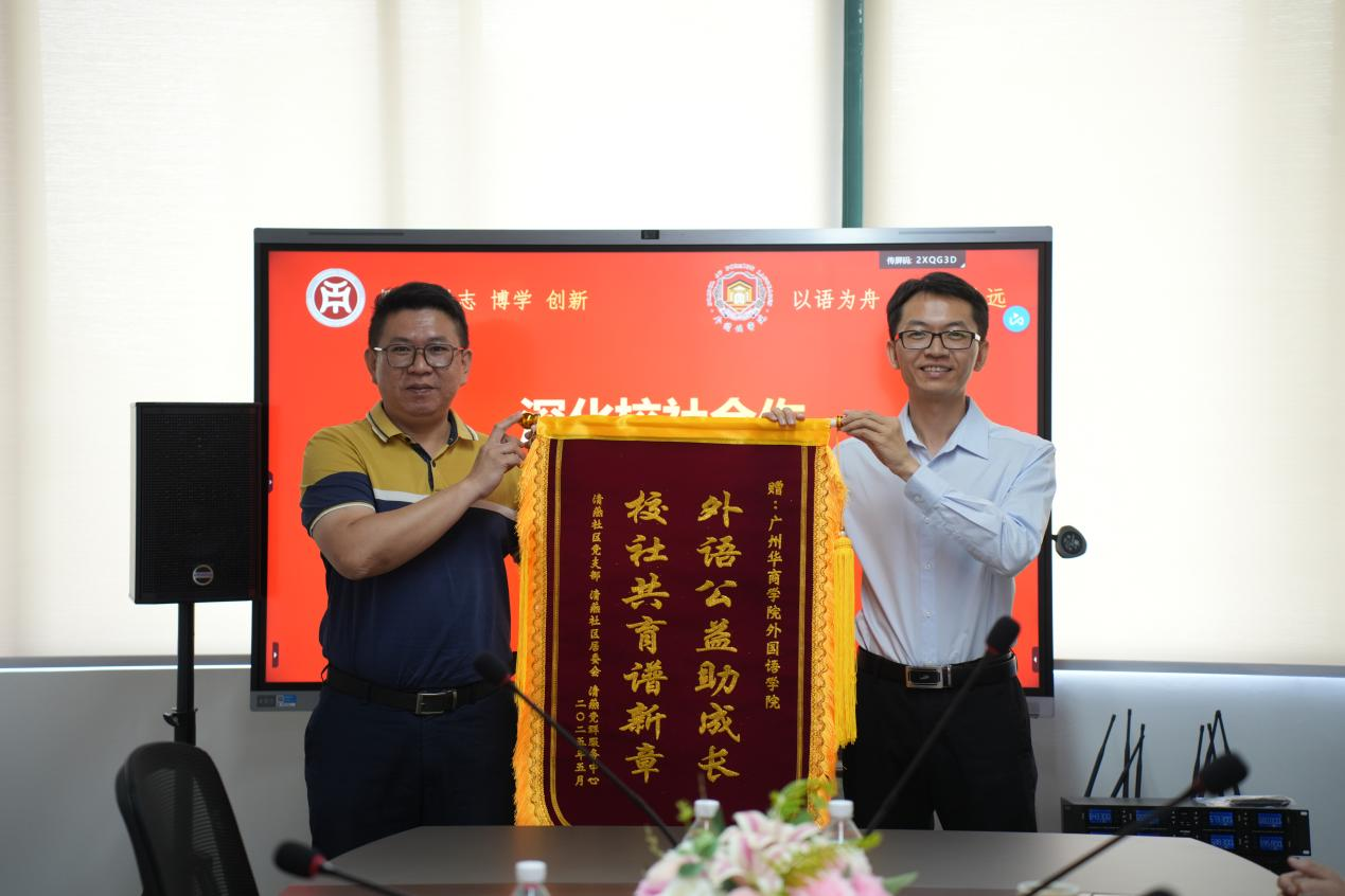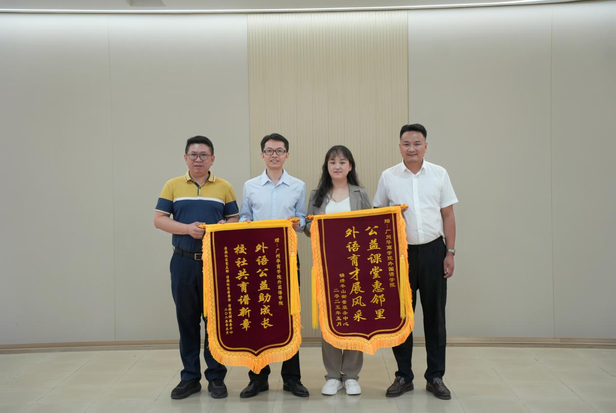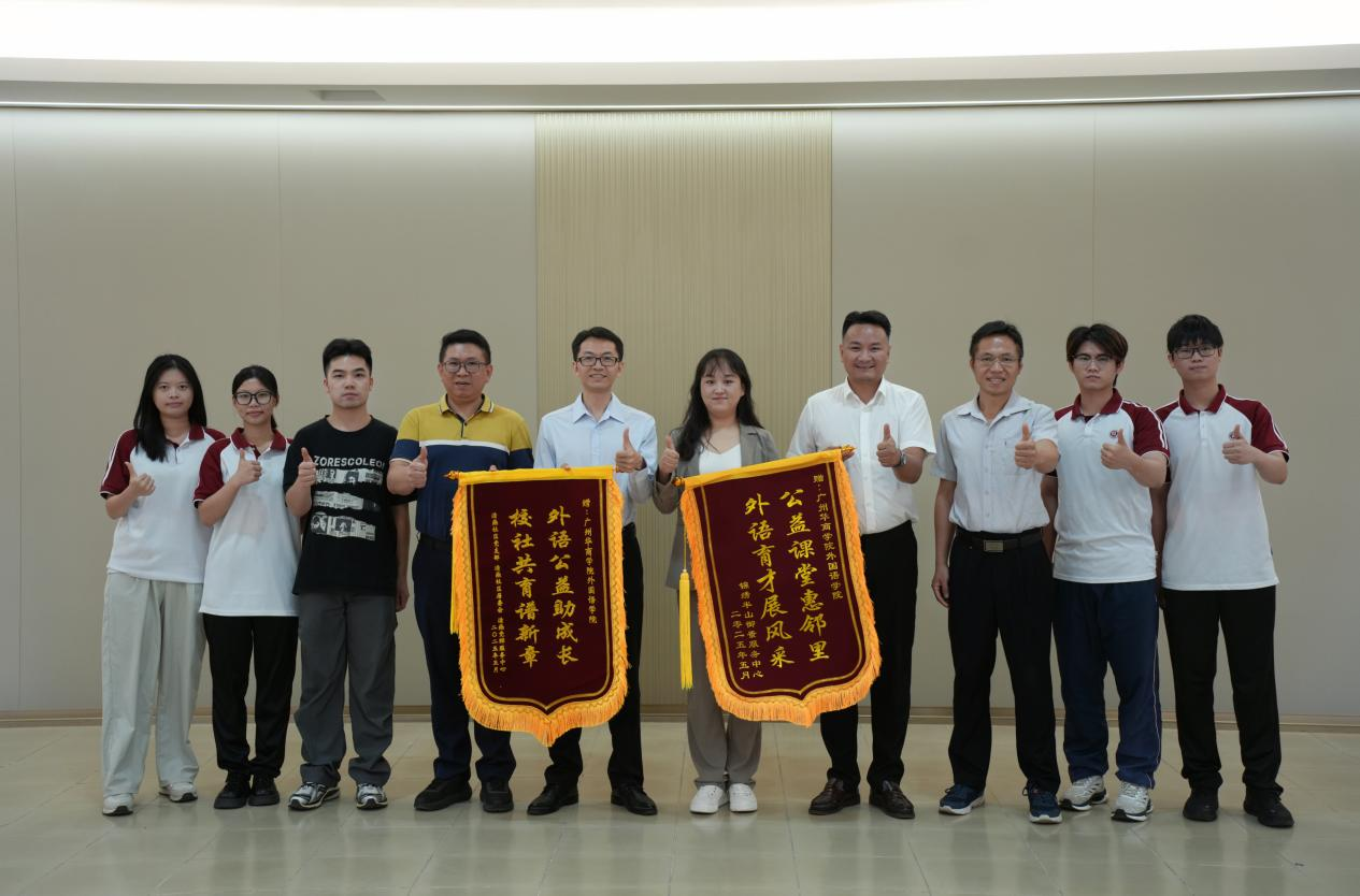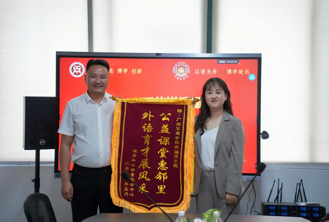 5月13日上午,威廉希尔中文网站外国语学院与增城区清燕社区、锦绣半山御景花园小区物业联合举办的“晚风学堂”英语晚辅公益项目赠锦旗仪式在创新楼403-2小会议室举行。清燕社区邓镜波书记、锦绣半山御景花园小区物业陈勇经理、外国语学院何顺发副院长及“晚风学堂”项目组全体成员共同见证这一校社协同育人的温暖时刻。“晚风学堂”不仅体现了外院学子践行社会责任的热忱,更是校社双向奔赴、共筑教育公益新模式的生动缩影。