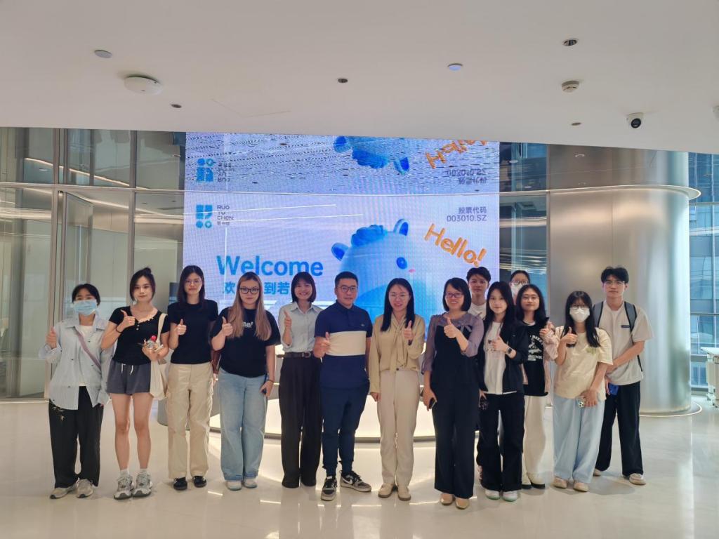 为深入贯彻落实产教融合理念,积极探索校企协同育人新模式,2025年5月27日下午,数字经贸学院跨境电商系老师张嘉欣、黄业群以及22级跨境电商专业学生一行12人前往广州若羽臣科技股份有限公司(以下简称“若羽臣”)开展交流调研活动。本次活动以实地考察与深度对话为抓手,推动实习基地建设,优化人才供给对接机制,助力跨境电商专业人才培养与行业发展。
