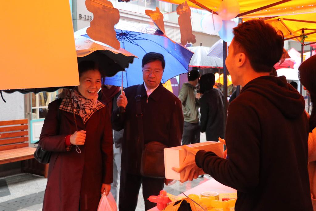 在开幕式开始前,我系各位领导老师冒着大雨提前来到现场,在每个参赛选手的摊位前关心选手们是否保暖好自己,销售的产品是什么,参加比赛感觉怎么样等。王德高主任也当起消费者,购买了参赛选手的商品,给予了参赛选手诚挚的肯定,希望他们可以在此次比赛中加油。