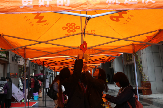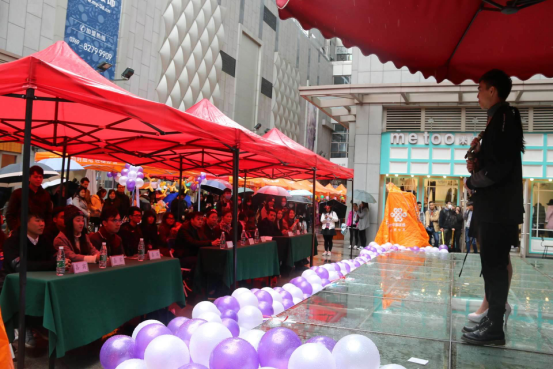 精致的呈现,只因有背后的默默付出,在各位工作人员冒雨布置好现场后,步行街出现了一顶顶橙色的帐篷,在风雨下增加了一抹靓丽的风景。