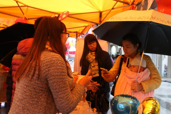 带着希冀,怀着信心,各位参赛者陆续回到摊位,学以致用地灵活践行各自的营销思想,大展各自的营销战略。纵使天气寒冷夹着雨,消费者却没有减少,大家来到各个摊位进行挑选询问,参赛者耐心的解答,并拿出实物和试饮给消费者尝试,让消费者有足够的保障,参赛者的热情和商品的价值让消费者立刻购买了商品。