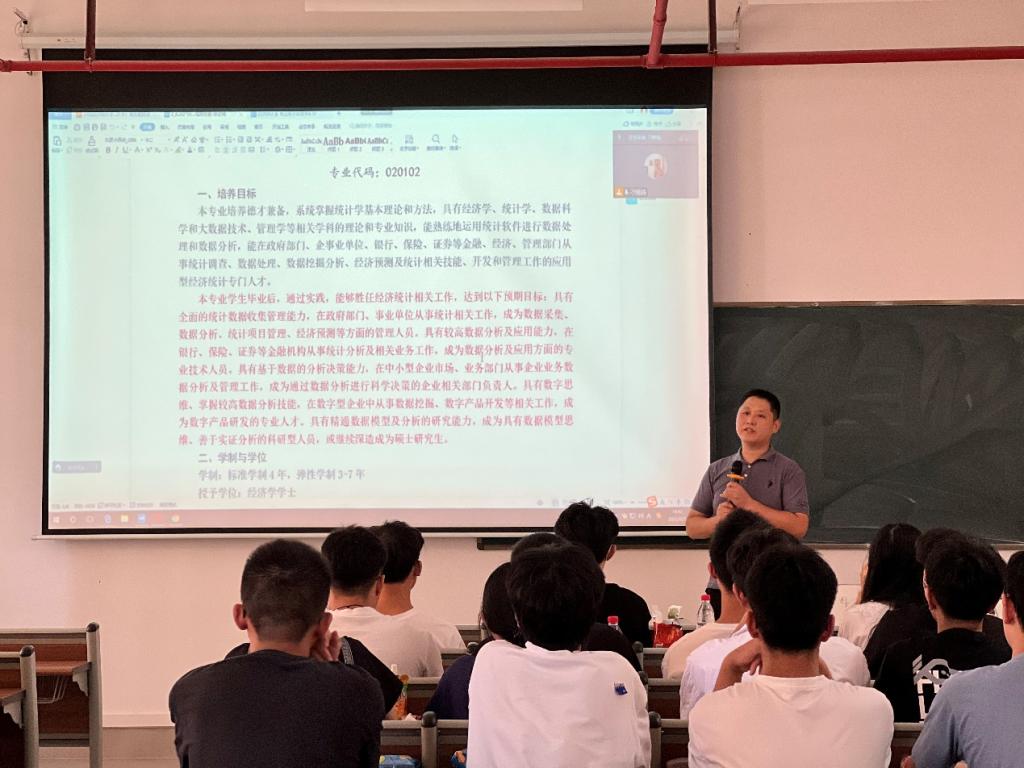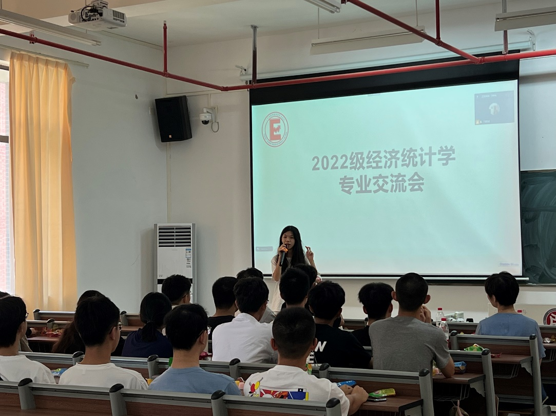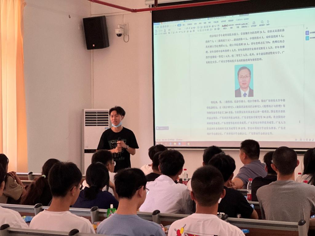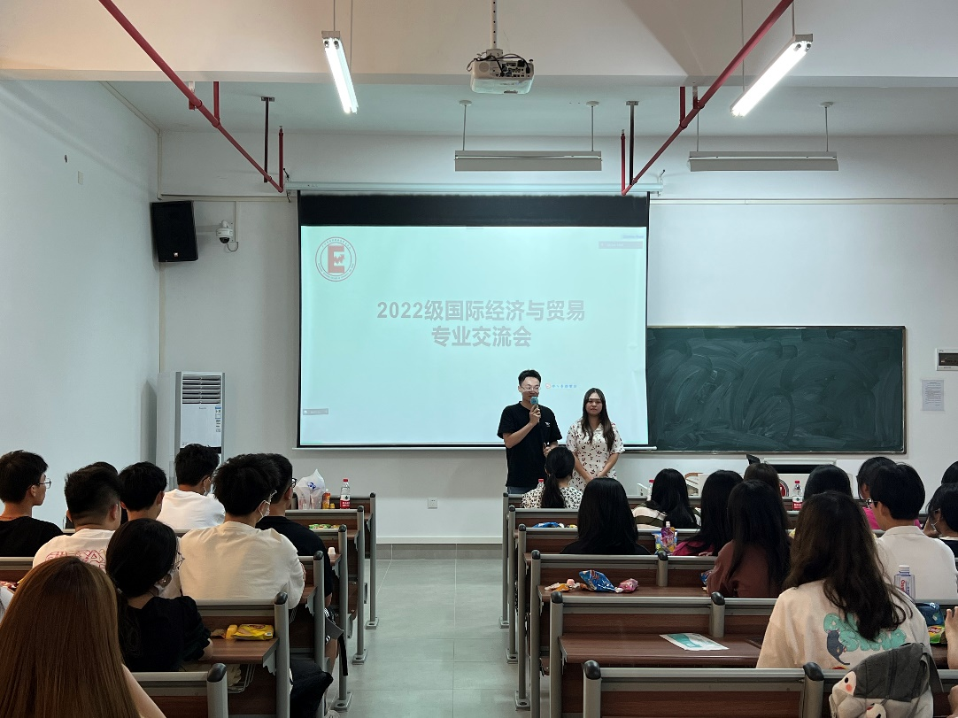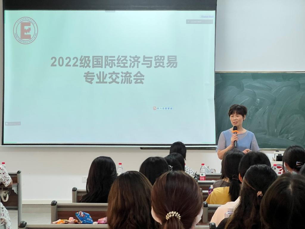 为让2022级新生对专业有更加深入的了解和认识,对即将开始的大学学习生活做好合理规划,经济贸易学院于2022年9月5日下午14:30在四会校区分专业召开2022级新生专业交流会。出席会议的有:经济贸易学院院长李广明教授,经济贸易学院副院长张真教授,跨境电子商务系李伟教授、曹维老师,经济统计学系石立副教授,国际经济与贸易专业教师代表陈婷老师,国际商务专业教师代表黄远香老师和优秀学生代表以及经济贸易学院2022级全体新生。