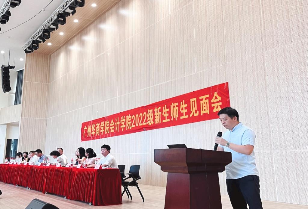 9月5日,威廉希尔中文网站会计学院2022级新生师生见面会在四会校区报告厅隆重举行。副校长兼会计学院院长陈美华,会计学院党委副书记兼副院长陈洋广,会计学院副院长杨旻、会计学院副院长兼办公室主任周书域、会计学院特聘教授刘善球等领导嘉宾出席本次见面会。见面会由会计学院学工办副主任杨烨瀚老师主持。