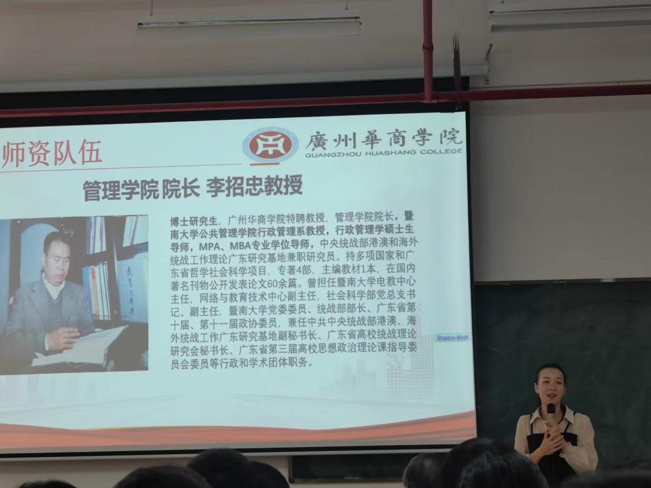 郑丽芬老师指出,行政管理专业具有广阔的就业前景,致力于培养既掌握行政管理政策法规和现代行政管理理论知识,熟悉基层组织情况,又掌握具体行政管理方法与技能、具有实际行政管理的复合型应用人才。其次,郑老师介绍了行政管理专业雄厚的师资力量,鼓励同学们对此充满信心、努力拼搏。最后,郑老师分享了历届师兄师姐成功的创业经历,激励同学们以此为榜样不断前行,成为优秀的华商学子。