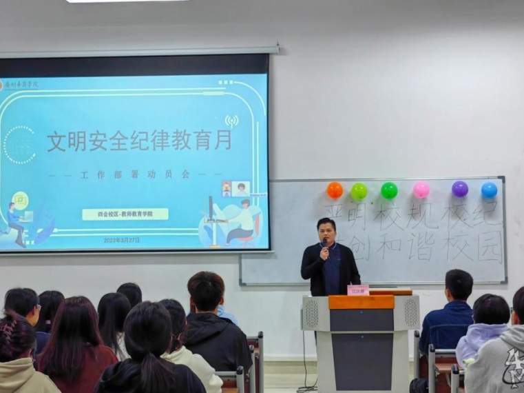 四会校区由江庆基老师为教师教育学院各组织和班级代表宣讲文明安全纪律教育月的相关文件及部署相关工作。