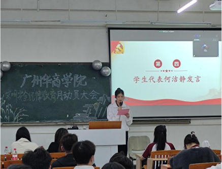 20级工商管理2班何洁静作为学生代表发言,明确学生在校文明、纪律、安全三方面的要求,号召同学们凝聚文明共识,提高安全意识,增强纪律观念,做到明大德、守公德、严私德,努力成为践行社会主义核心价值观的表率,促进具有华商特色的文明校风、优良学风形成,共建和谐健康的美好校园。