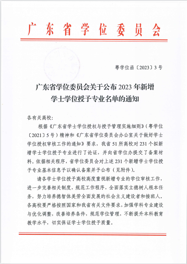 近日,广东省学位委员会发布《广东省学位委员会关于公布2023年新增学士学位授予专业名单的通知》,公布了今年广东省51所高校的231个新增学士学位授予专业。威廉希尔中文网站工商管理、数据科学与大数据技术、健康服务与管理、税收学、中药学、化妆品科学与技术、小学教育、金融科技、翻译9个专业获得学士学位授予权。