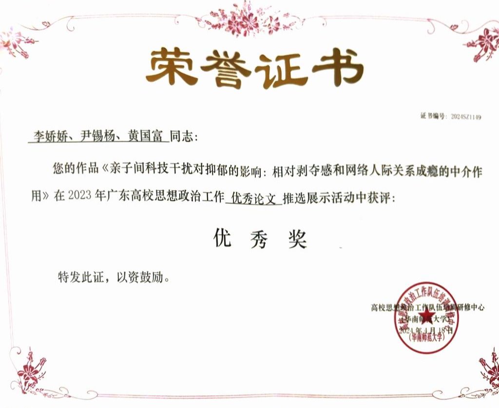 《亲子间科技干扰对抑郁的影响:相对剥夺感和网络人际关系成瘾的中介作用》 | 优秀奖 |