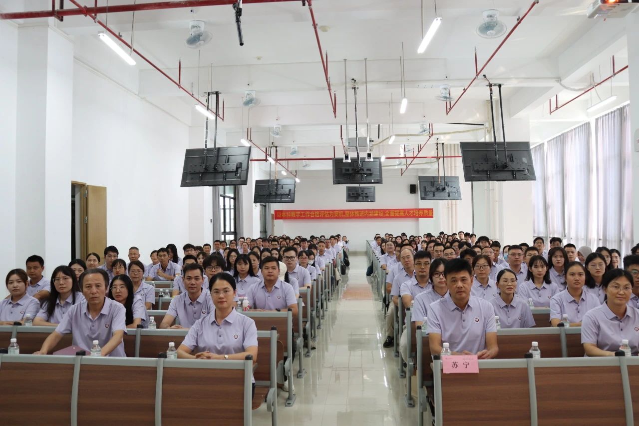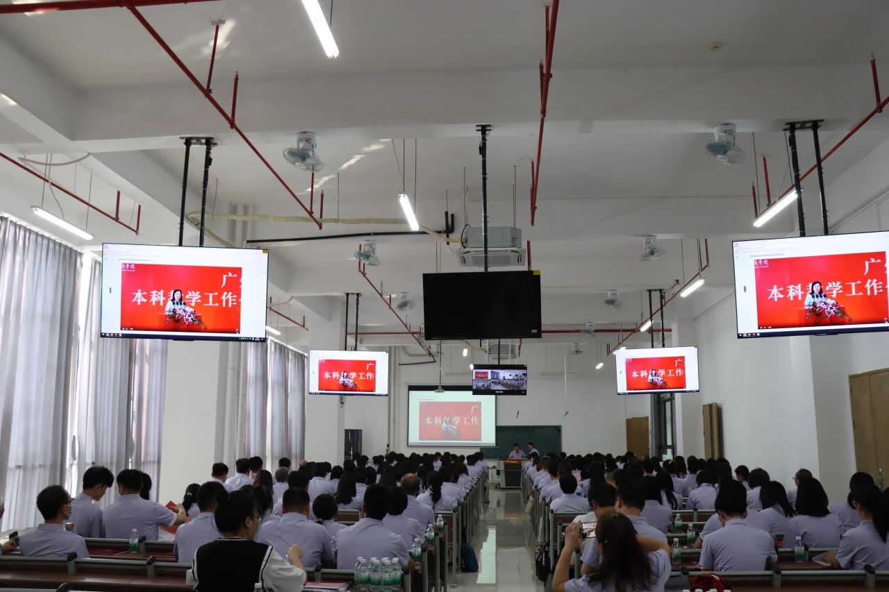 10月8日,威廉希尔中文网站以线上+线下的方式在两校区同步召开本科教学工作合格评估责任落实大会。主会场设在广州校区图书馆报告厅,广州校区分设七个分会场,肇庆校区同步设一个分会场。华商教育集团董事长廖榕就、学校董事会领导、学校顾问、特邀嘉宾、学校党政领导班子全体成员、校长助理、各二级学院及职能部门负责人主会场参会,全体教职员工分会场参会。会议由学校党委书记陈玉欢主持。