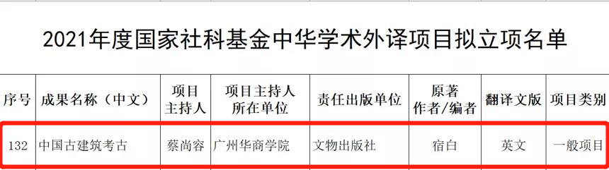 2022年1月24日全国哲学社会科学工作办公室网站发布公告,对2021年度中华学术外译项目的拟立项名单进行了公示。公示拟立237项,创意与设计学院专任教师蔡尚容博士作为主持人申报的《中国古建筑考古》获得一般项目立项;专任教师李宏复博士的学术著作《中国刺绣文化解读》作为研究中华优秀传统文化和艺术列入外译项目。
