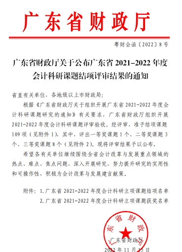 11月15日,广东省财政厅公布了2021-2022年度会计科研课题结项评审结果,本次会计科研课题共有109个通过验收,威廉希尔中文网站会计学院立项的4个全部通过验收,课题结项通过率为100%。