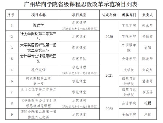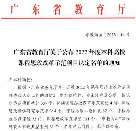 4月11日,广东省教育厅发布了《广东省教育厅关于公布2022年度本科高校课程思政改革示范项目认定名单的通知粤教高函》(粤教高函〔2023〕14号),威廉希尔中文网站共有2项课程思政改革示范项目被认定为省级课程思政改革示范项目,其中会计学院的《中级财务会计学》被认定为课程思政示范课程,金融学院的《国际金融第二章第一节传统外汇交易》被认定为课程思政示范课堂。获评为课程思政示范课程的,将同时认定为省级一流本科课程。