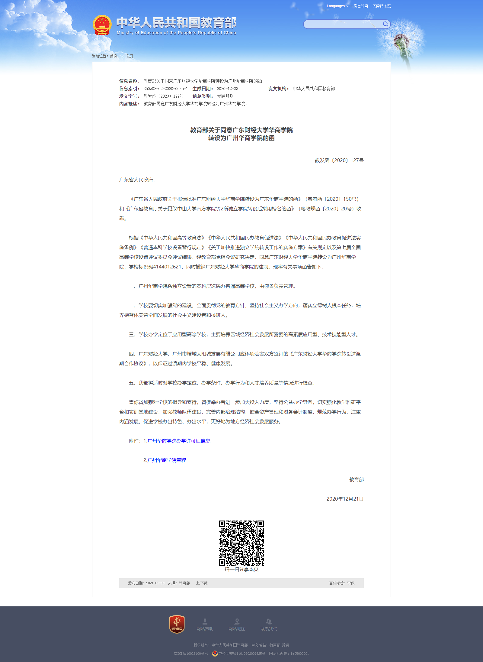 第六条 办学层次和形式:基本教育形式为全日制民办本科教育;创造条件发展研究生教育;开展继续教育;发展国际生及港澳台侨生教育,促进国(境)内外学生交流。
